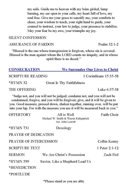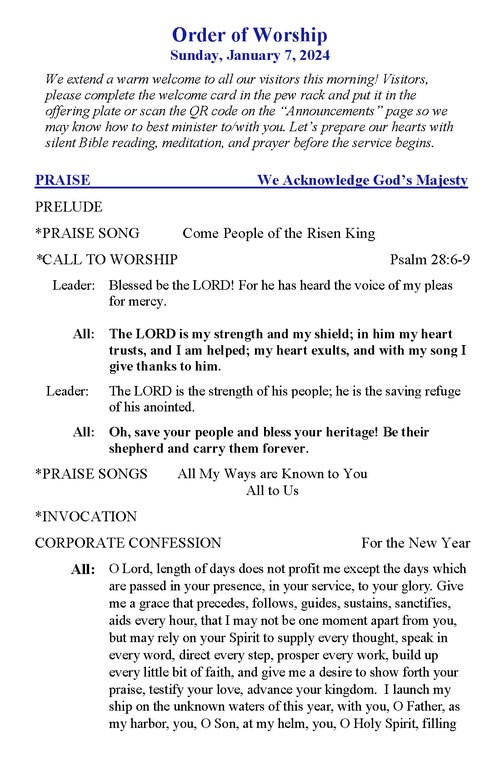 We extend a warm welcome to all our visitors this morning! Visitors, please complete the welcome card in the pew rack and put it in the offering plate or scan the QR code on the “Announcements” page so we may know how to best minister to/with you. Let’s prepare our hearts with silent Bible reading, meditation, and prayer before the service begins.
